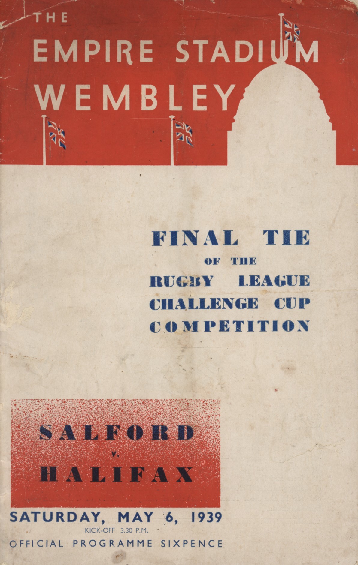 Official programme for the match at Wembley, May 6th 1939. An attack of flu played havoc with the strongly fancied Salford team and they were outplayed by Halifax who won the game 20-3.