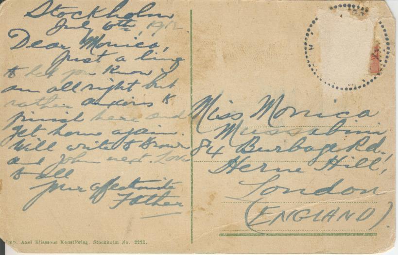 Original postcard of some Swedish children in costume. Sent by Sam Mussabini, the successful athletics coach best known for his work with Harold Abrahams, to his daughter Monica while attending the 1912 Summer Olympics in Stockholm. It was written on July 6th, just a few days before he coached William Applegarth to a gold and a bronze medal, and he confided that he was "rather anxious to finish here and get home again".