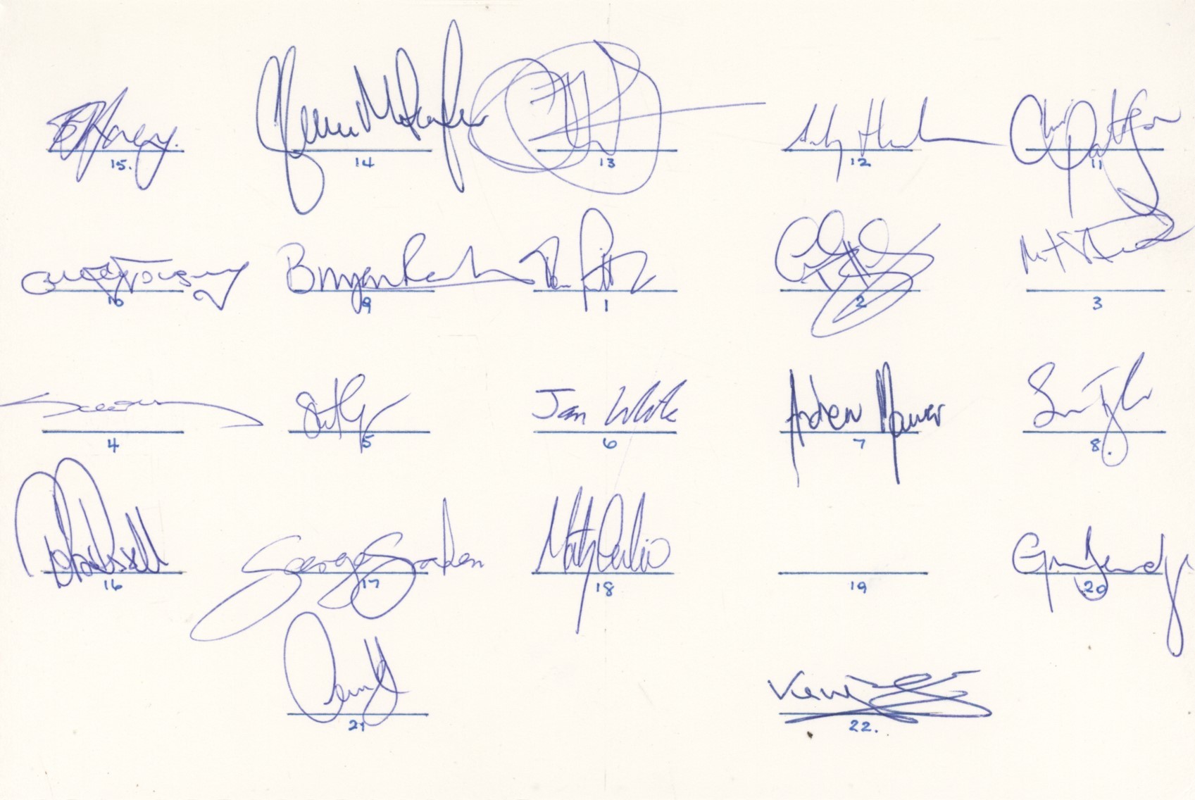 Card signed by 21 members of the Scottish rugby squad that played Italy in Rome on February 16th, 2002. They won the match 29-12. Players include Redpath, Patterson, Townsend and Metcalfe.