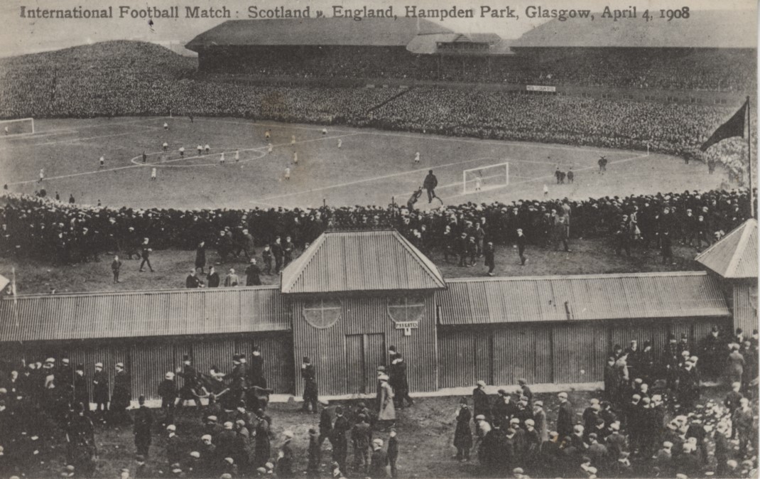 Valentine Series. Black and white postcard photograph of the international between Scotland and England, played at Hampden Park on April 4, 1908. The match was drawn 1-1.