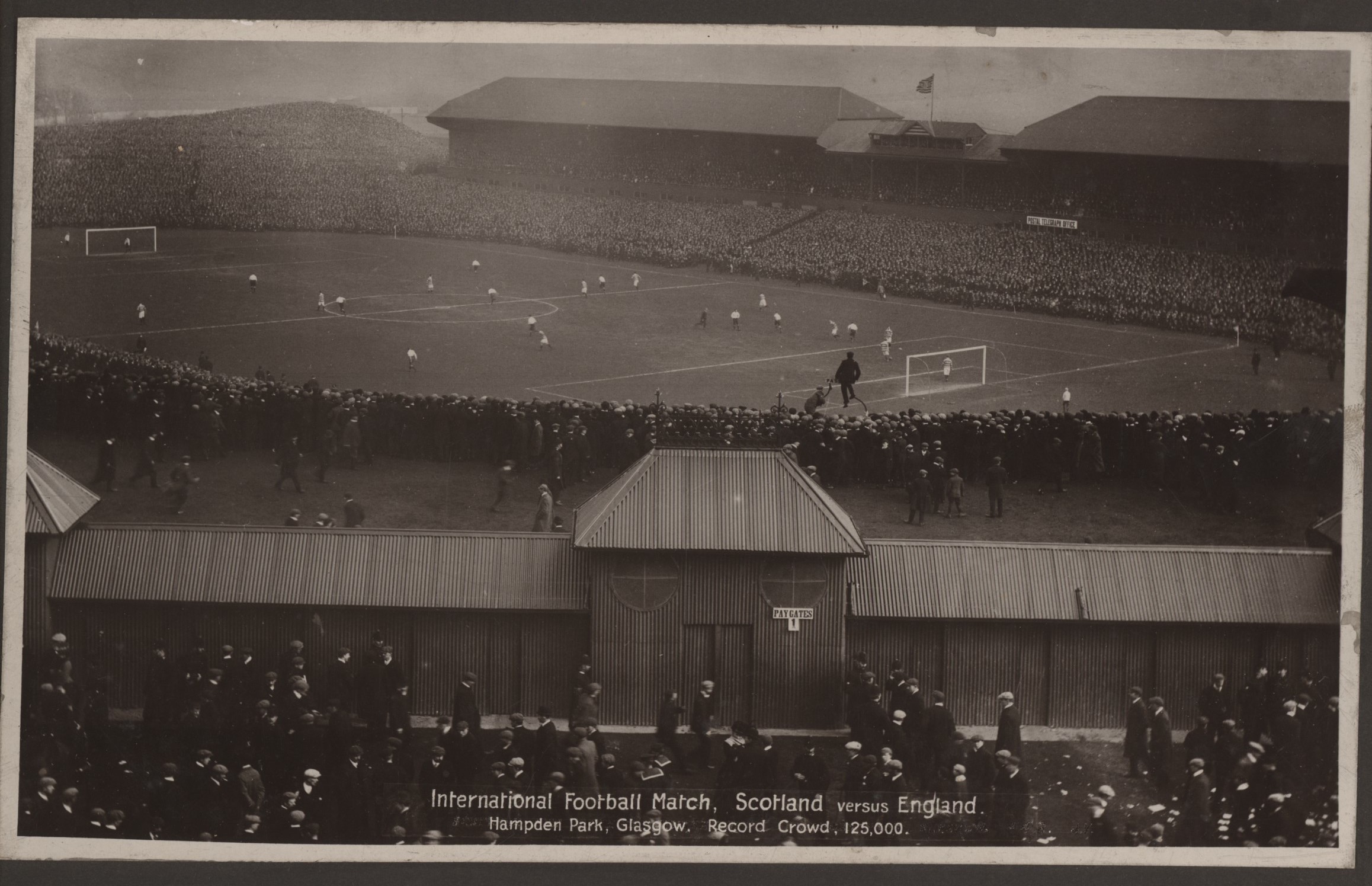 Original black and white photograph showing the match in progress. The game, played at Hampden Park in front of a world-record crowd of over 121,000 on April 4th, 1908, ended in a 1-1 draw. This photograph captures the enormous crowd, with many more still arriving in the foreground.