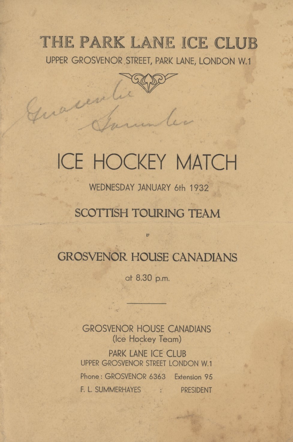 Other Sports » Winter Sports » Ice Hockey » Memorabilia » SCOTTISH TOURING TEAM V GROSVENOR HOUSE CANADIANS 1932 ICE HOCKEY PROGRAMME