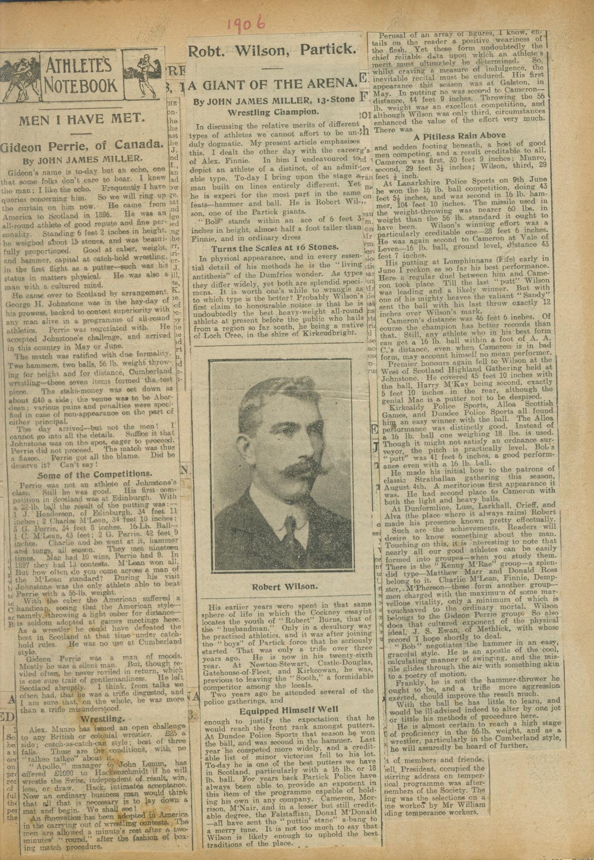 Nicely assembled scrapbook with newspaper and magazine cuttings describing Scottish wrestlers and some other sports (including Highland Games), from 1904-1930s. Two early photographs of Highland Games are pasted to inside cover - both are a little dark.