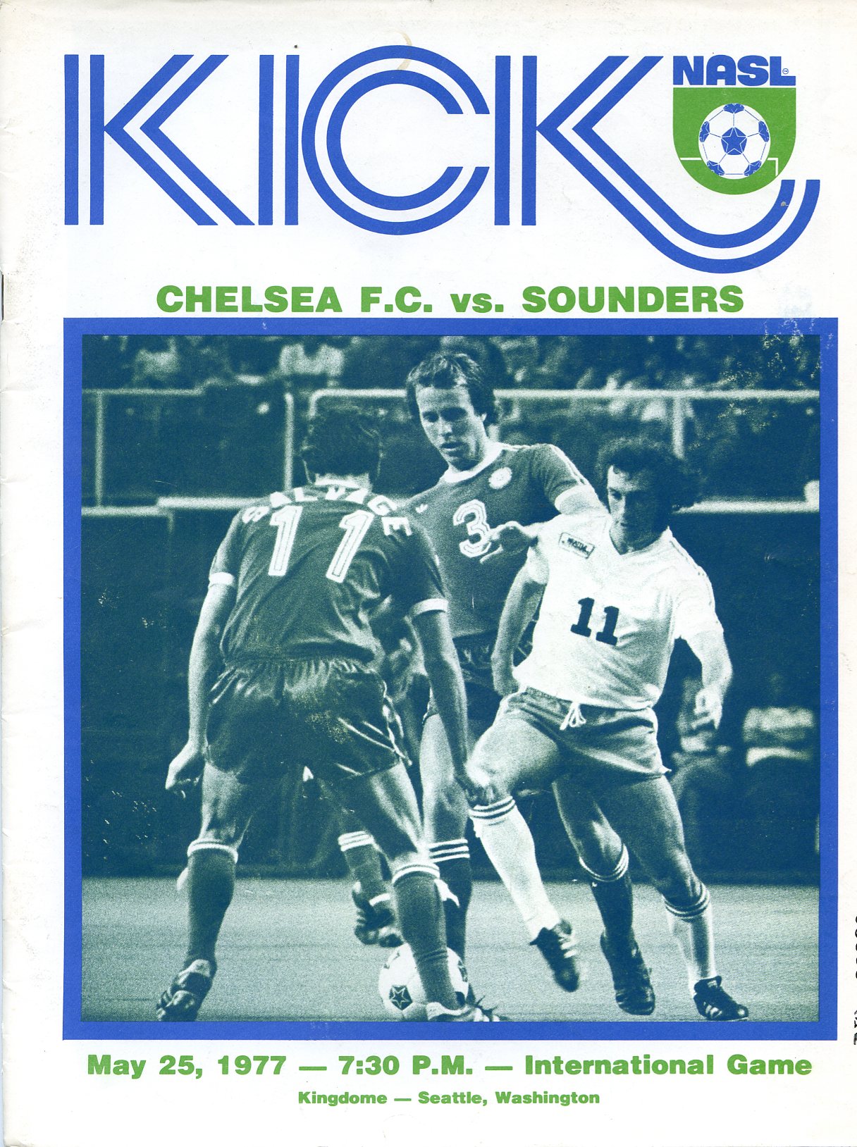 Official football match programme from the match between the NASL Seattle Sounders and Chelsea played at the Kingdome, Seattle on May 25th 1977.