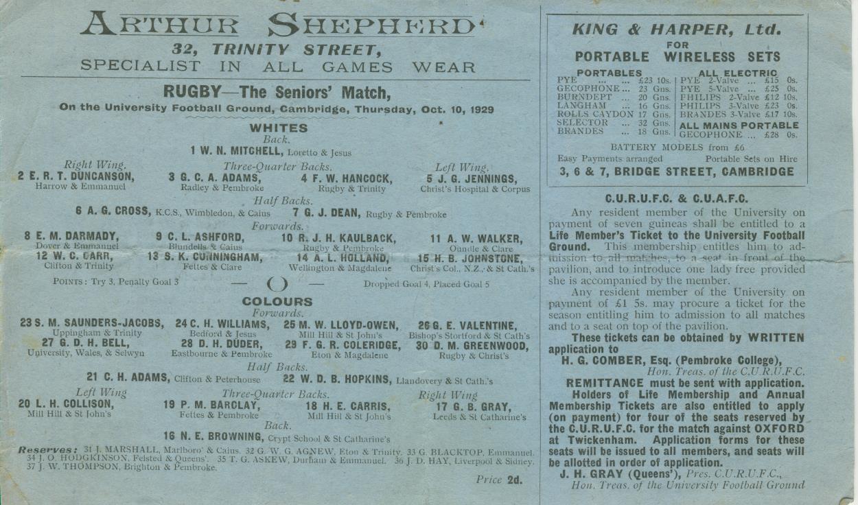 THE SENIORS' MATCH 1929 (CAMBRIDGE UNIVERSITY) RUGBY PROGRAMME