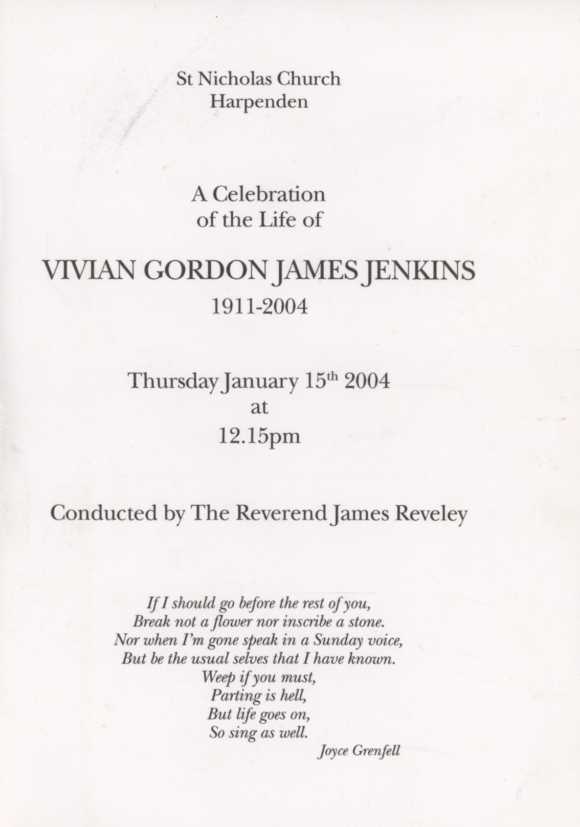 Order of service pamphlet for the memorial service of Vivian Jenkins, held in Harpenden on January 15th 2004. Jenkins played rugby for Wales and the British Lions and was also a successful sports journalist.