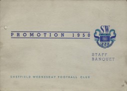 Menu card for a staff banquet to celebrate promotion to Division 1, held at the Grand Hotel, Sheffield, on 14th August, 1950. Signed on the inside cover in ink by Derek Dooley and Norman Jackson, and by 11 further guests, presumably staff.