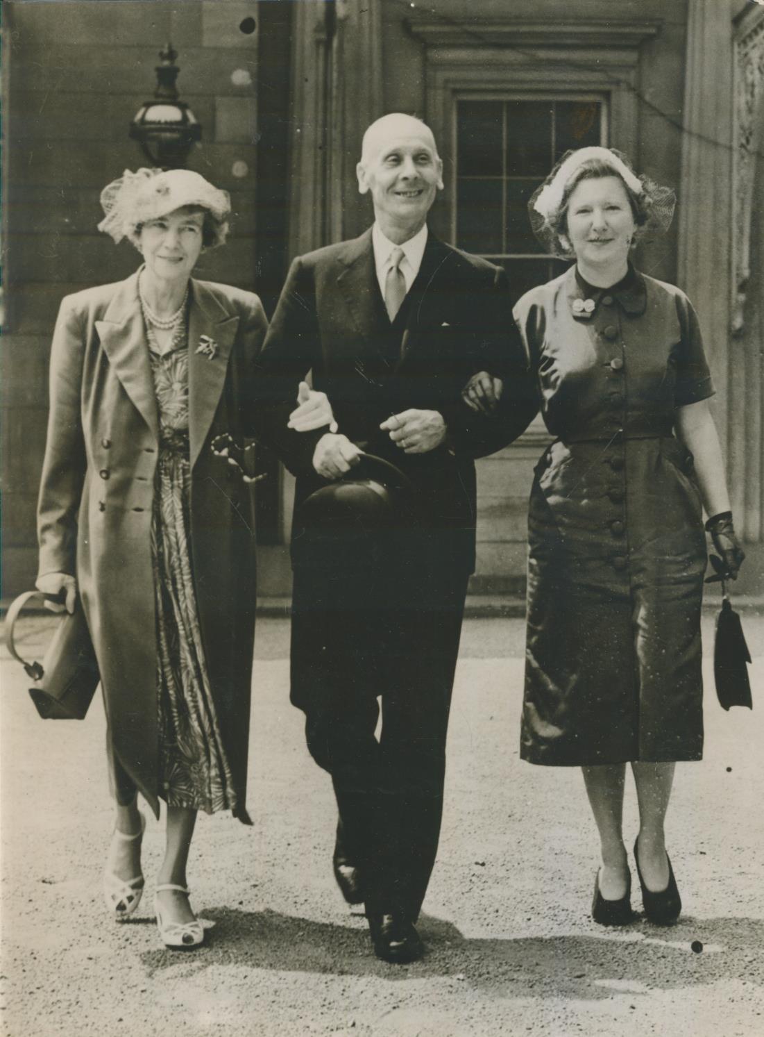 Original Press photograph of Sir Jack Hobbs arm in arm with his wife and daughter-in-law as he leaves Buckingham Palace after receiving his knighthood from the Queen on June 30th 1953.