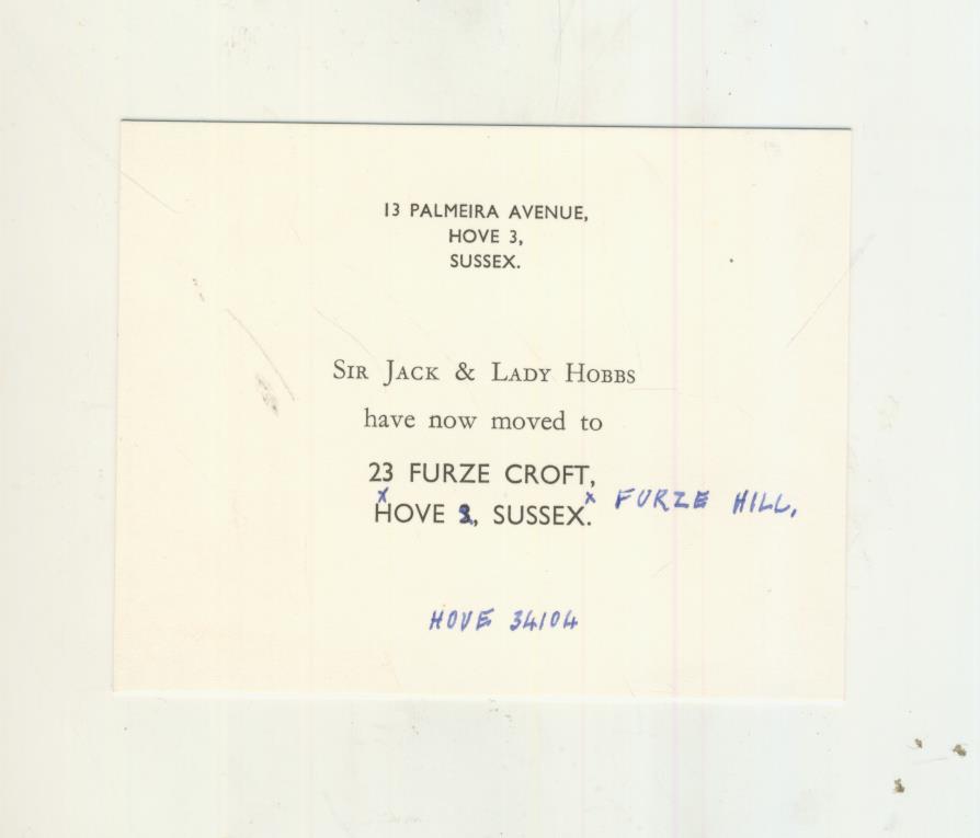 A change of address card from Sir Jack & Lady Hobbs, confirming their change of address from 13 Palmeira Avenue, Hove, to 23 Furze Croft. This was their last move as they both died in 1963, while resident at Furze Croft. The address has been slightly altered in ink and a telephone number added in Hobbs' familiar hand.