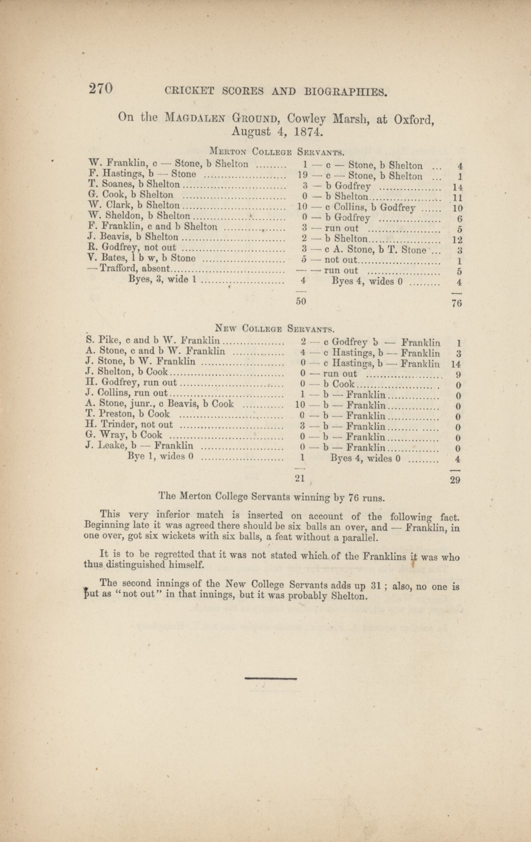 Disbound page from Arthur Haygarth's "Cricket Scores and Biographies", giving a printed scorecard of a match between Merton College Servants and New College Servants, played on August 4th, 1874. As the match started late it was decided that each over should consist of 6 balls. A Merton player by the name of Franklin (there were two in the team and it is not clear which this was) took six wickets in one over.