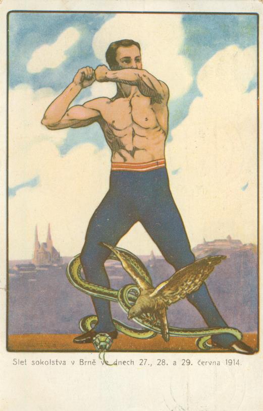 Coloured postcard of a poster designed to promote the large gymnastics festival (slet) organised by the Sokol Movement and held in Brno (Czech Republic) in 1914 (just before the outbreak of WWI). Postally used and signed to reverse in pencil by at least 9 people, all unidentified. Good condition.