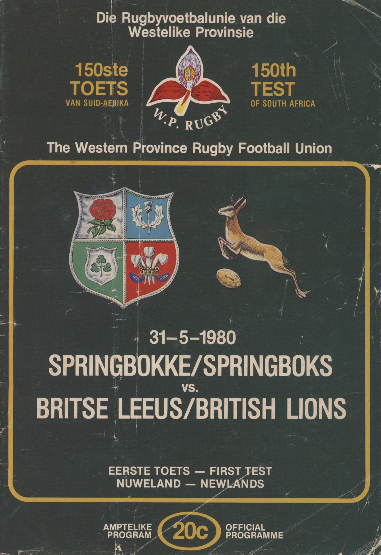 Official rugby programme for the 1st Test Match, South Africa's 150th, played at Newlands on 31st May 1980. South Africa won a close match 26-22 scoring 5 tries to the Lions' 1.