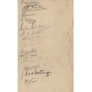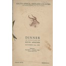 Menu card for a dinner held in honour of the South Africans at the Grand Hotel, Birmingham on 21 October 1931, after a match against the Midland Counties. Embossed decoration and original ribbon still in tact. Signed on the back cover in pencil and ink by 14 players from both teams, including P de Villiers, SR de Toit, J White, JC Tindall, JH van der Westhuizen (ink) and SC Louw (ink) of South Africa. The other signatures include T Coulson, the captain of the Midland Counties team. From the collection of the Cambridge blue G.H. Bailey, with his pencil signature to front.