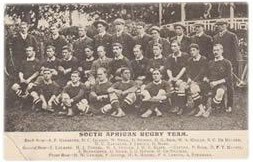 Postcard. Photograph of South Africa Rugby Union Touring Team 1906, with names to front, and the legend "defeated by Scotland, November 18th" written in ink to back. Postally unused. Sl crease marks, otherwise good.