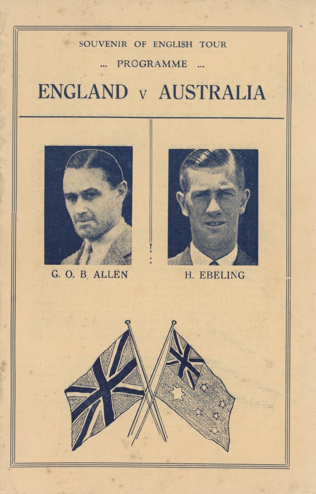 Pre-tour, issued by the Victoria Cricket Association for the 1936-37 England tour of Australia under Gubby Allen. With biographies of Allen and some leading Victorian cricketers, score sheet and some statistics.