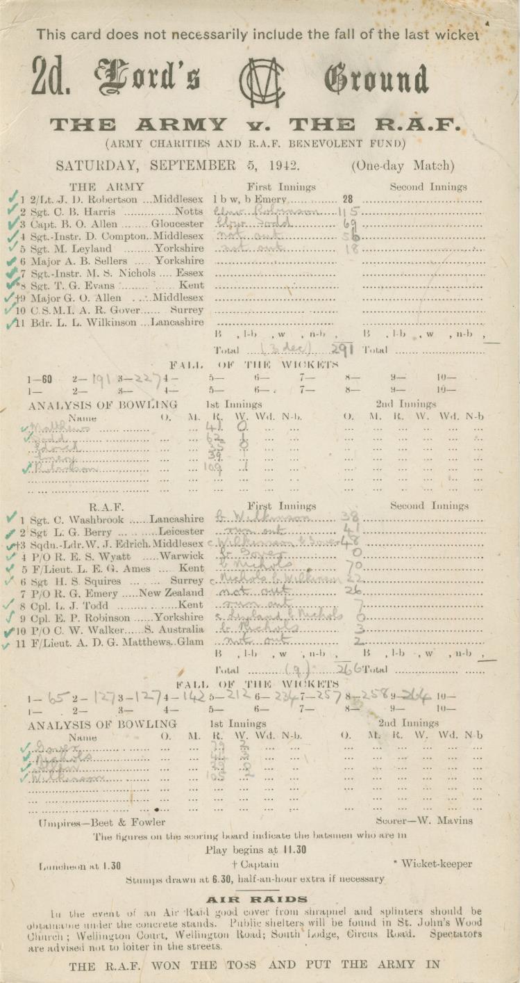 Official cricket scorecard. Lord's, September 5th 1942. Two very strong teams, won fairly comfortably by The Army.