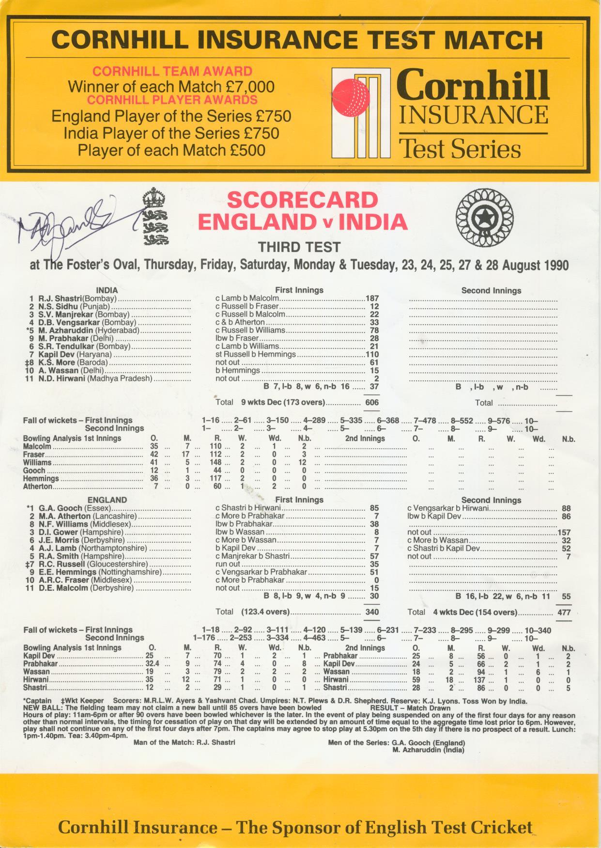 Cricket » Cricket Scorecards » Test Matches In England » ENGLAND V INDIA 1990 (OVAL) CRICKET SCORECARD - SIGNED BY AZHARUDDHIN