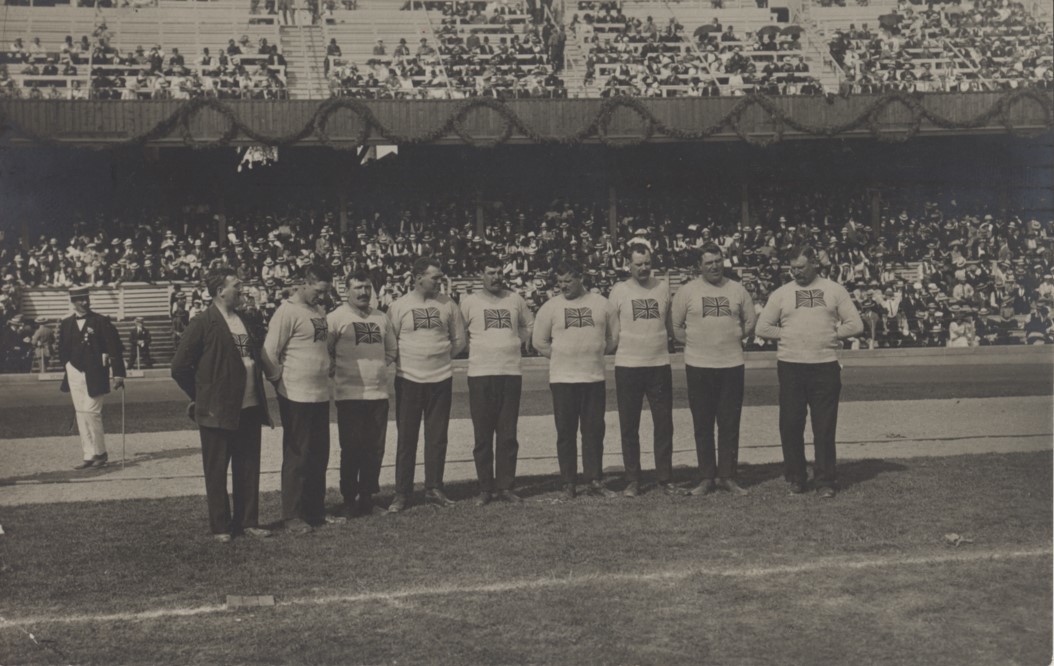 Original postcard from the 1912 Stockholm Olympics, showing the English tug of war team that took home the silver medal. Published by Brefkort.