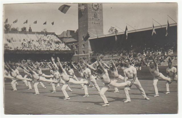 Real photograph of the Swedish gymnastic team who won the Men's Gold, in action in the Stockholm Olympic Stadium, 1912. Postally unused. Sl frayed, otherwise G.