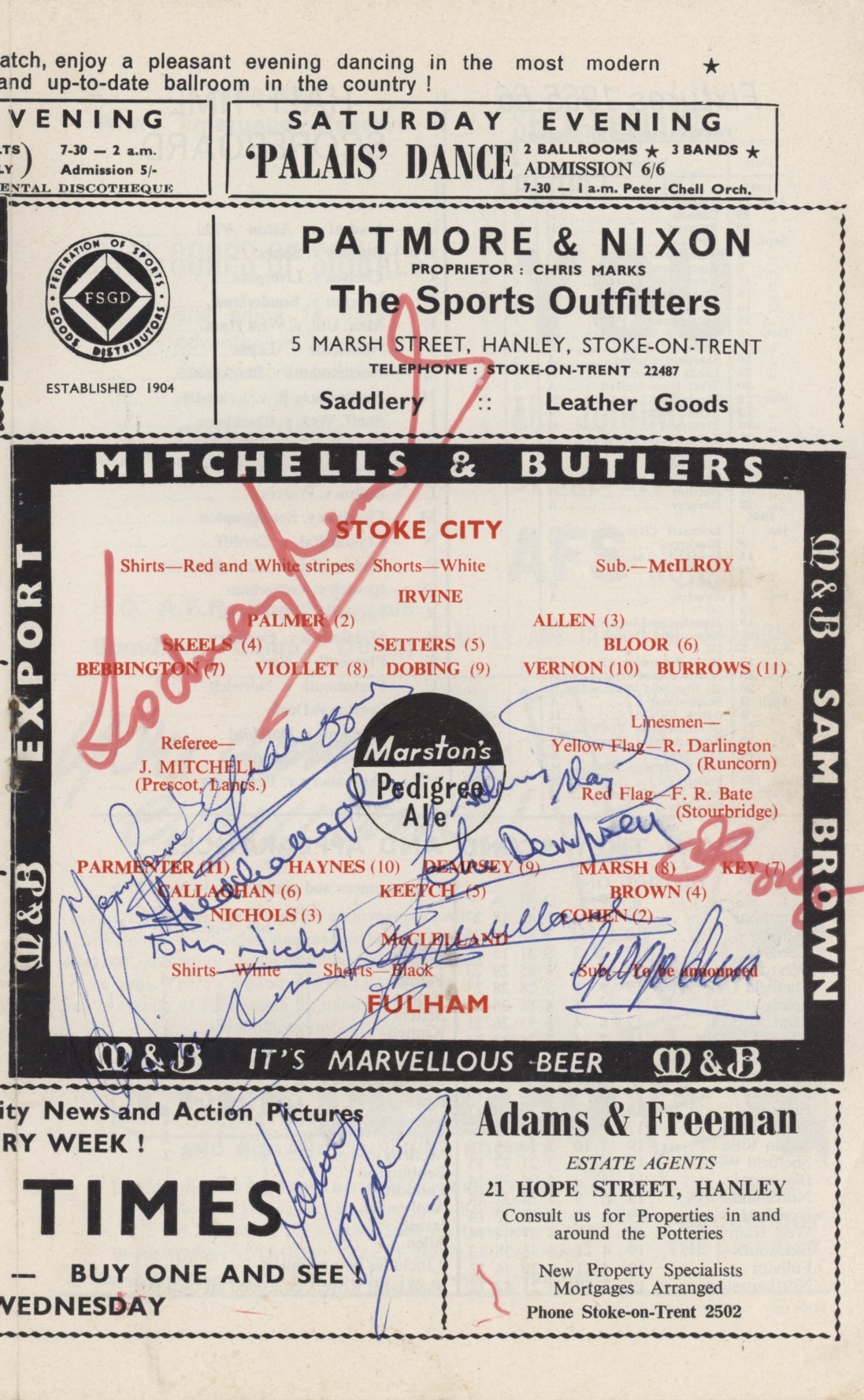 Official football programme for the match played on December 4th, 1965. Signed to the centre page by the full Fulham team, including Haynes, Marsh, Cohen, McClelland, Dempsey, Callaghan, Parmenter, Key, Nichols, Leggat and two others (one is possibly John Ryan).