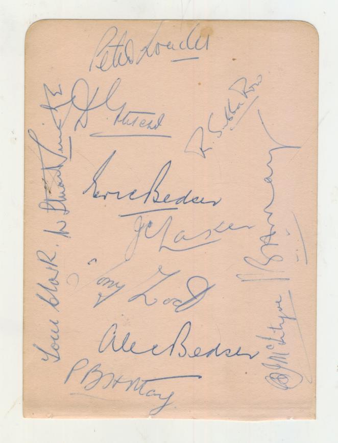 Album page. Signed in ink by 11 Surrey players from the early 1950s. These include Surridge, May (signed twice), Lock, E Bedser, A Bedser, Laker, McIntyre, Loader, Clark, Subba Row and Fletcher (I think). Signed on the reverse very nicely by the great Yorkshire cricketer Emmott Robinson.