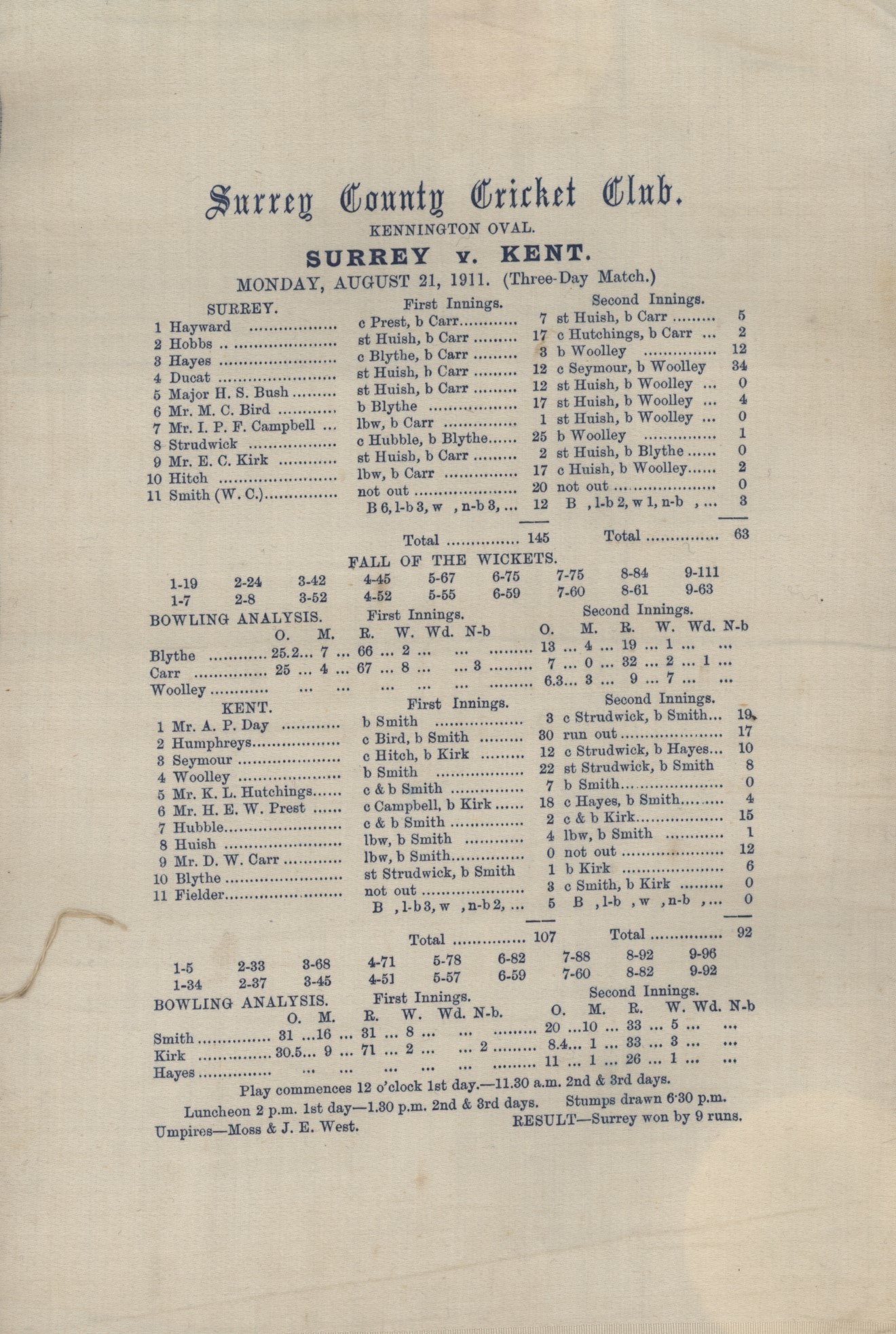 Commemorative scorecard, printed on silk, for the match played at the Oval on August 21-23, 1911. Surrey won a close contest by 9 runs with Smith taking 13 wickets in the match. For Kent Carr toon 10 wickets in the match (including 8 in the first innings) and Woolley took 7-9 in 6.3 overs, but to no avail.
