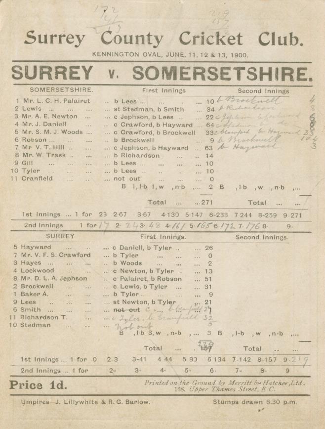 SURREY V SOMERSET 1900 CRICKET SCORECARD
