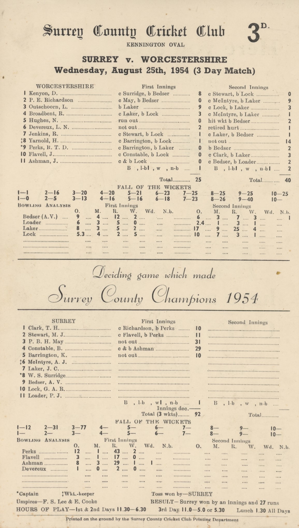Cricket scorecard from the Oval. August 25-26, 1954. Surrey won by an innings and 27 runs, which confirmed them as County Champions. Worcestershire were bowled out for 25 & 40, the lowest aggregate in any completed county match, with Tony Lock having combined figures of 6 for 5 off 15.3 overs.