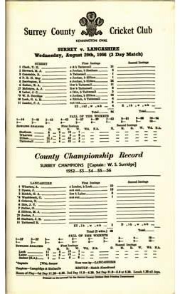 Oval, Aug 29 - 31, 1956. Drawn. Rain ruined this match, confirming Surrey as Champions for the fifth successive year. Tattersall took 6 for 32 for the disappointed runners-up.