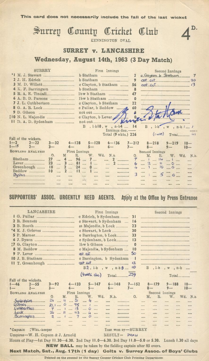 Cricket » Cricket Scorecards » Surrey » SURREY V LANCASHIRE 1963 CRICKET SCORECARD - SIGNED BY STATHAM