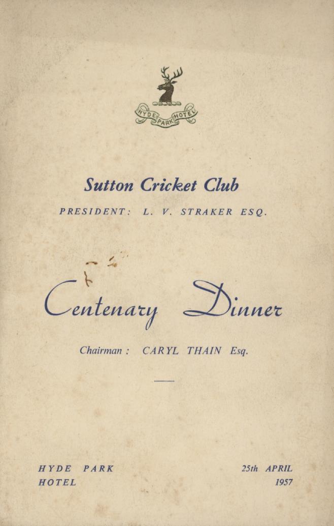 Cricket » Cricket Memorabilia » Cricket Menus & Cards » SUTTON CRICKET CLUB CENTENARY DINNER MENU 1957