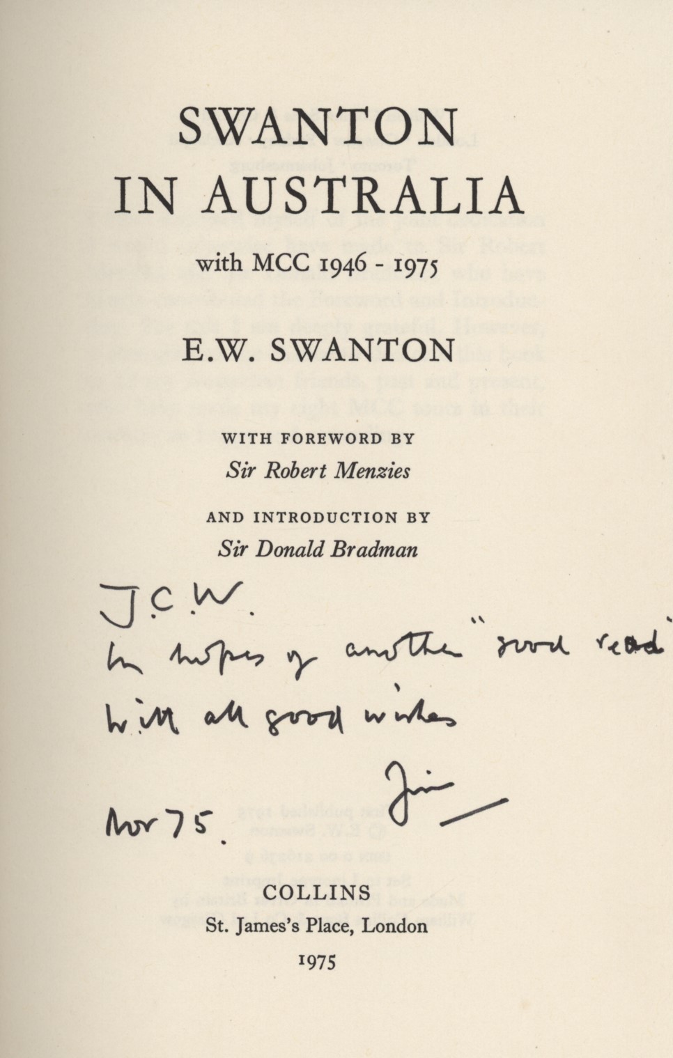 8vo. 251pp. 16 pages of photographs. Dust-wrapper, very good. Signed and dedicated by Swanton to fellow cricket writer/journalist John Woodcock to title-page. Also signed by Woodcock to fly-leaf.