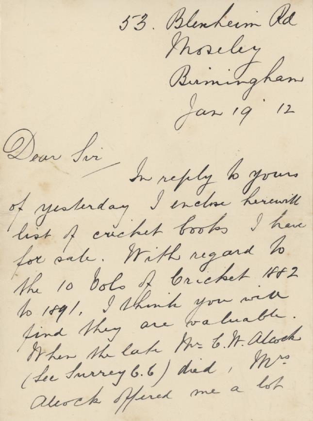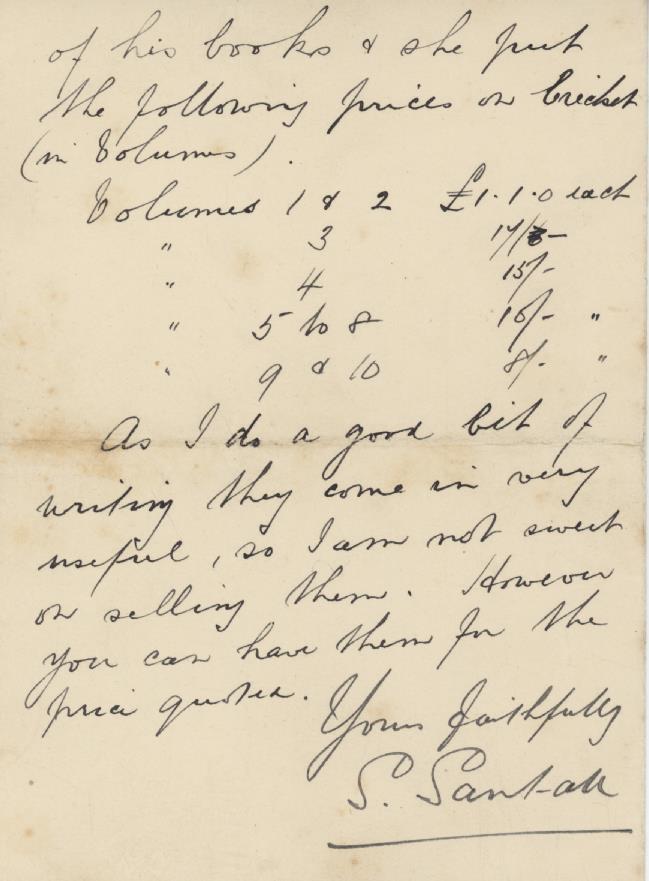 Handwritten letter from Sydney Santall (dated 1912), who played cricket for Warwickshire between 1892 and 1914 and also ran a sporting goods shop. It is possible that this also included selling books as in this letter Santall is offering for sale a run of "Cricket" from 1882-1891, volumes that came from the estate of Charles Alcock, the great football and cricket administrator. Signed nicely by Santall.