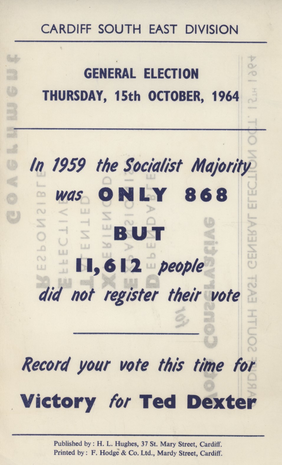 Election flyer for Ted Dexter as he attempted to take Jim Callaghan's Cardiff South-East seat for the Conservatives in the 1964 General Election.