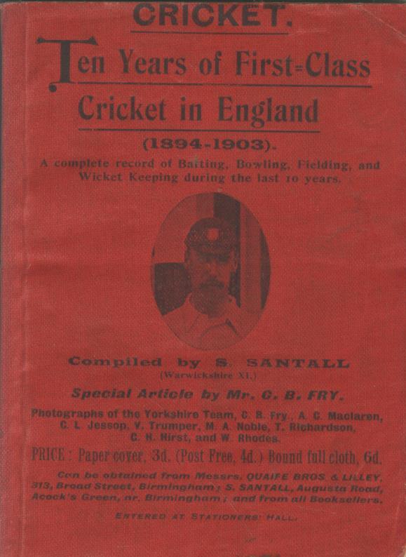 A statistical record of the period 1894 to 1903 with full page photogrtaphs of many of the great cricketers of the time, including Fry, Maclaren, Richardson, Jessop, Trumper, Noble, Rhodes and Hirst.