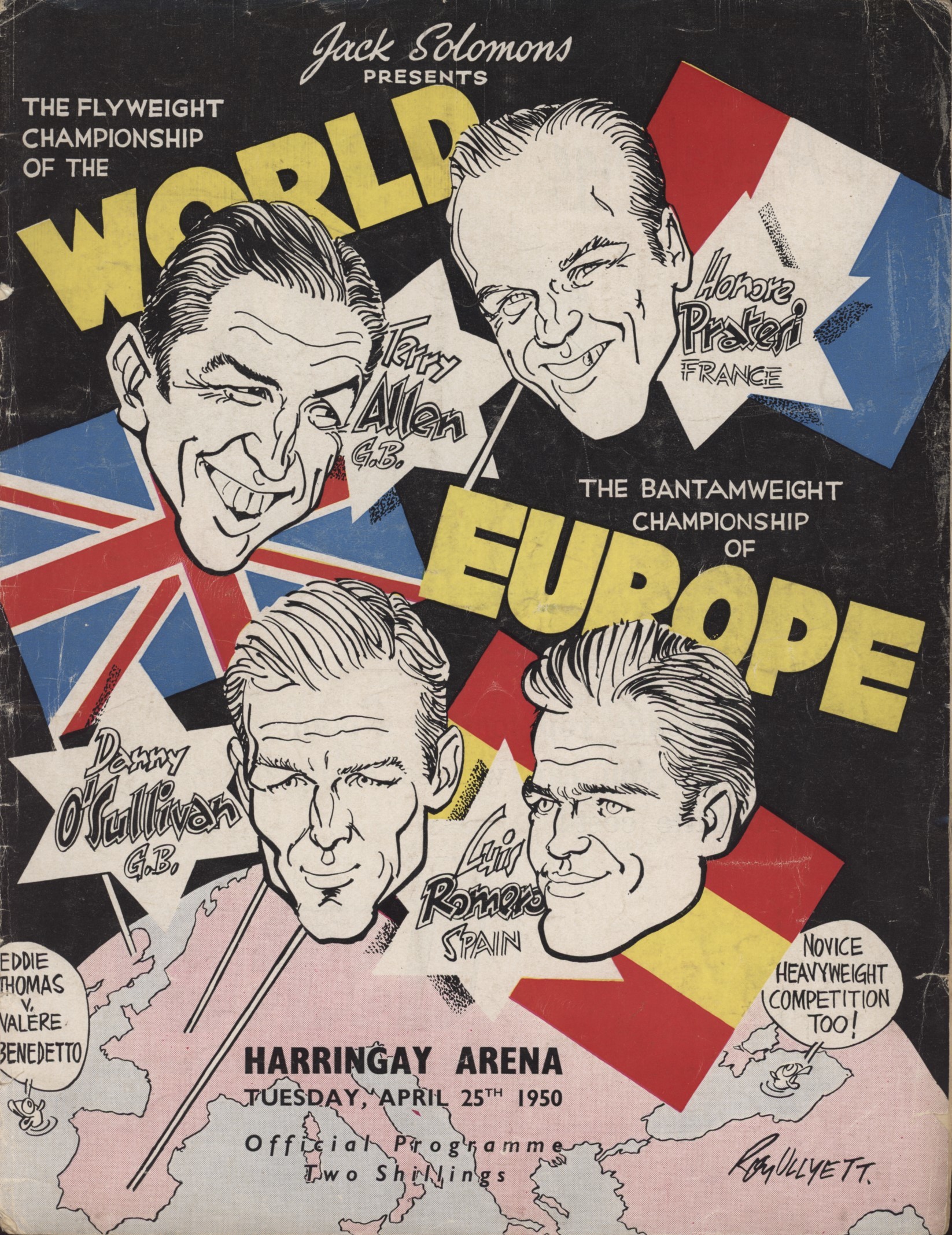 Official souvenir programme for the Flyweight Championship of the World, held at Harringay Arena on April 25th 1950. Also includes the Bantamweight Championship of Europe fight between Luis Romero and Danny O'Sullivan.