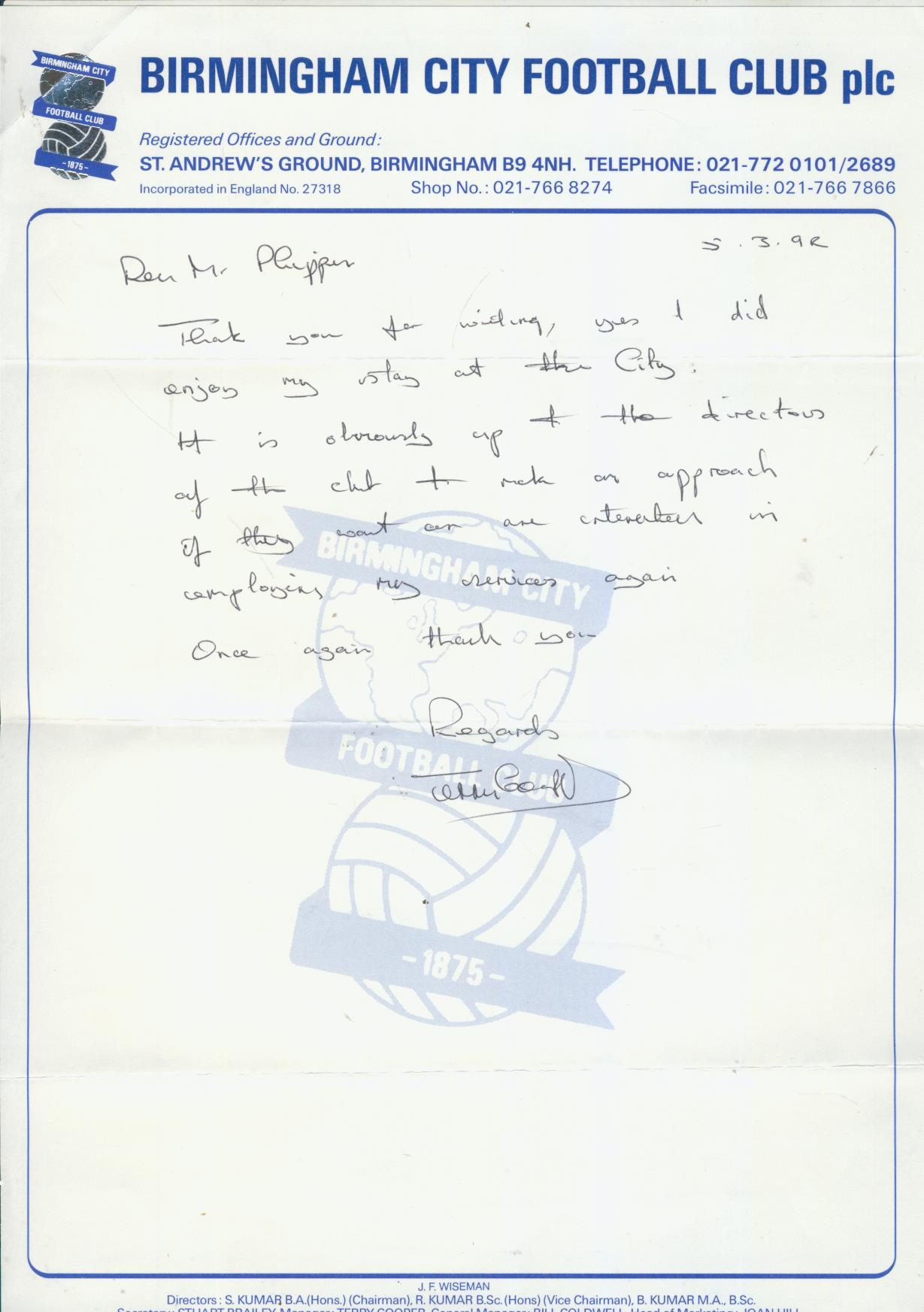 Handwritten letter on Birmingham City Football Club paper, dated March 1992. In it Cooper talks about enjoying his stay in the city and stating that it is up to the directors to make an approach if they would like to employ his services again. This probably refers to Exeter City, who he had managed previously and was to do so again.