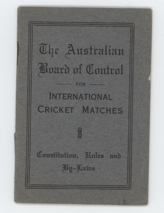 Pocket-sized handbook to the remit of the Australian Board of Control and its rulings for international cricket as agreed at their Annual General Meeting in Melbourne in 1922.