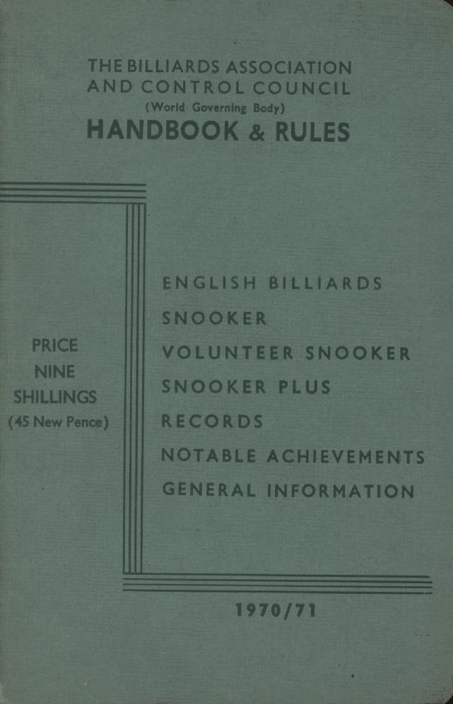 The official rules governing billiards and snooker for the 1970/71 season, plus historic tournament records and illustrated with photographs of leading players such as Rex Williams, John Spencer, Eddie Charlton and Ray Reardon.