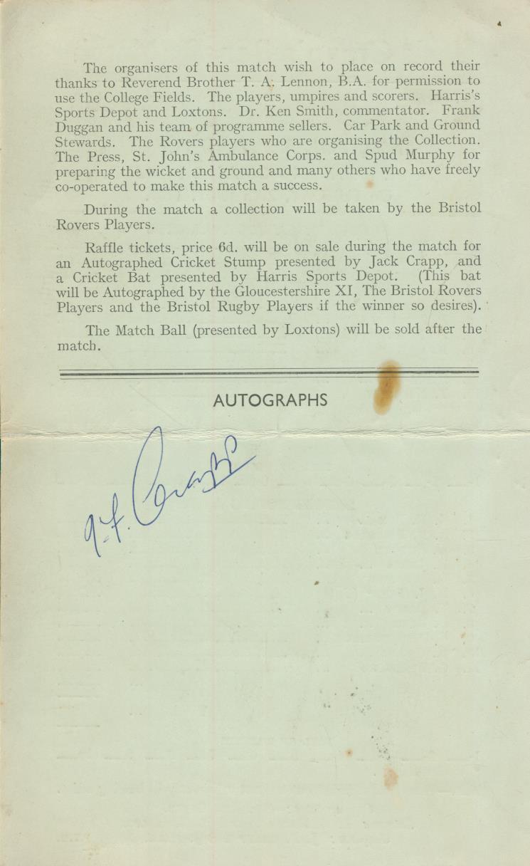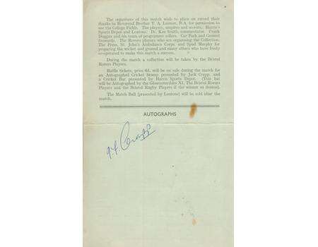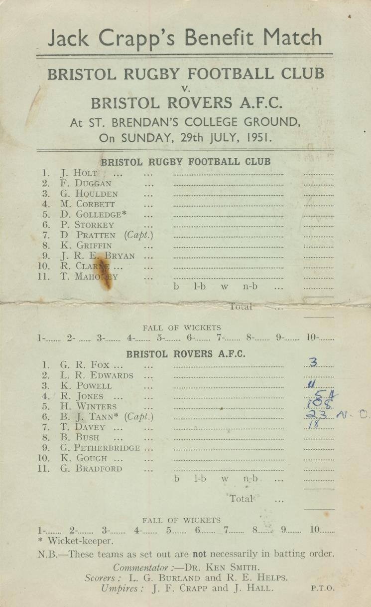 Cricket » Cricket Scorecards » Minor Counties/Clubs » BRISTOL RUGBY FC V BRISTOL ROVERS 1951 CRICKET SCORECARD (JACK CRAPP'S BENEFIT)