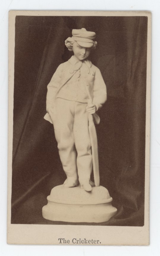 An original photograph of a statue titled "The Cricketer", laid down on card with title beneath. Nothing at all is known about this, although the photograph is likely to be late Victorian or Edwardian.