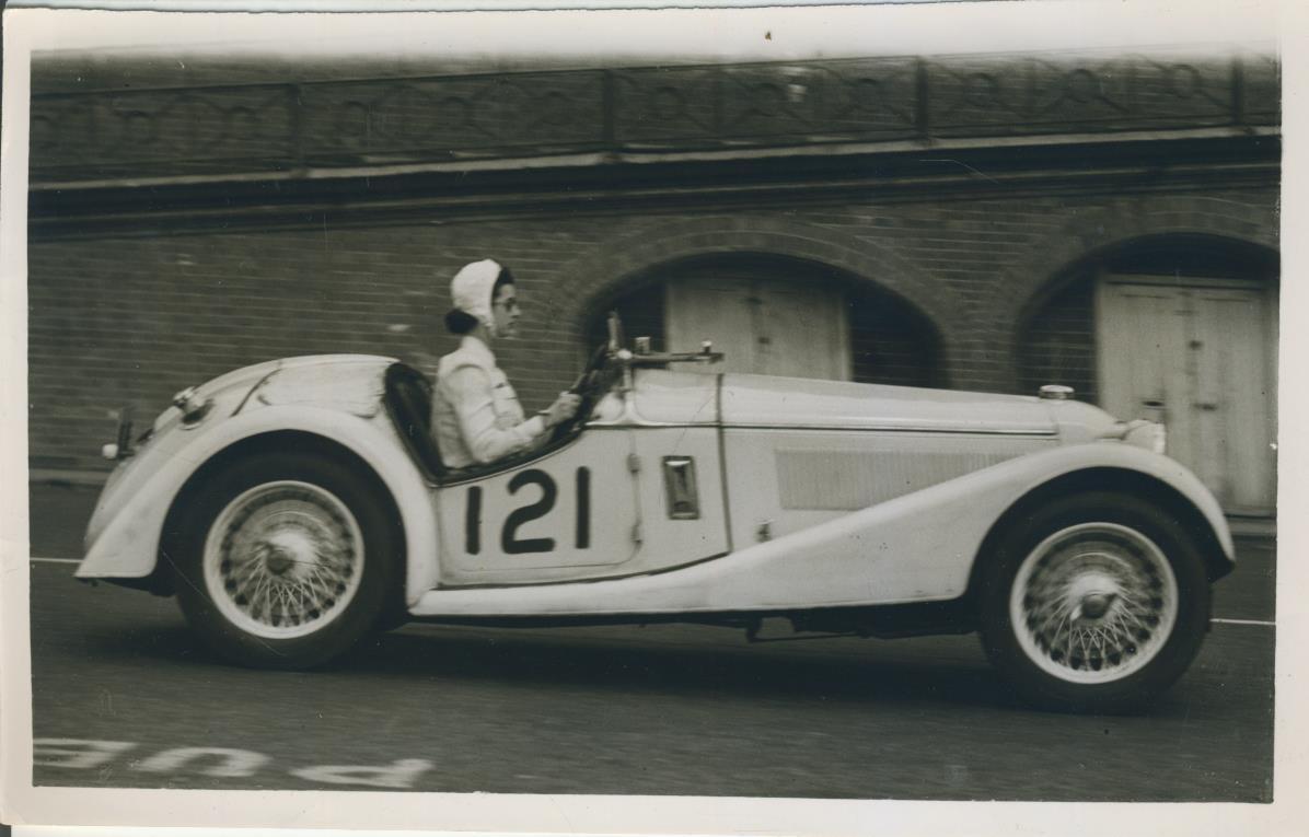 Original Press photograph showing the Hove Motor Club's International Speed Trials along Madeira Drive, Brighton. Pictured is Joan Gerard racing her Riley Sprite in the Ladies Only Trial for Standard Sports Cars.