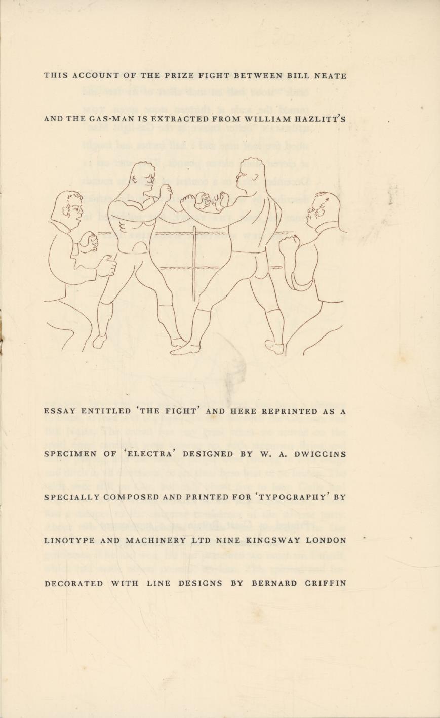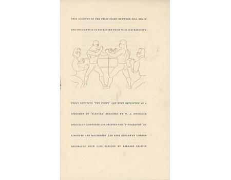 Nicely produced booklet featuring an extract from William Hazlitt's essay describing the epic boxing match between the butcher Bill Neate and 'Gaslight Man' Tom Hickman on 11 December 1821, first published in the New Monthly Magazine 1822.