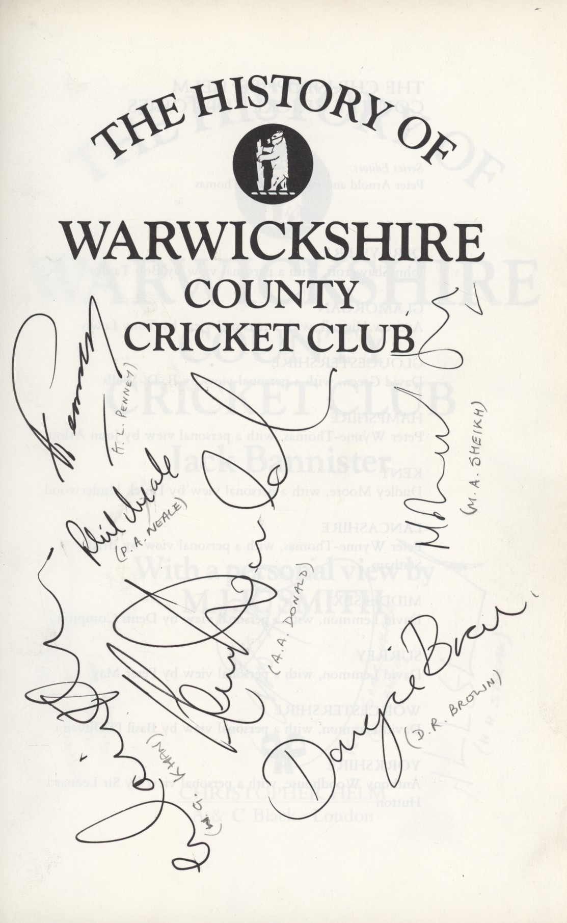 Jack Bannister, with over 40 years connection with the Bear and Ragged Staff county, traces the fortunes of Warwickshire from the very early days to the 1990s. Signed to front endpapers by 33 Warwickshire cricketers, incuding Donald, Reeve, MJK Smith, Knight, Woolmer (as coach), Streak, Sangakkara, Maddy, Steyn, Piper, Small, Penney, Asif Din, Neale, Twose and Giles.