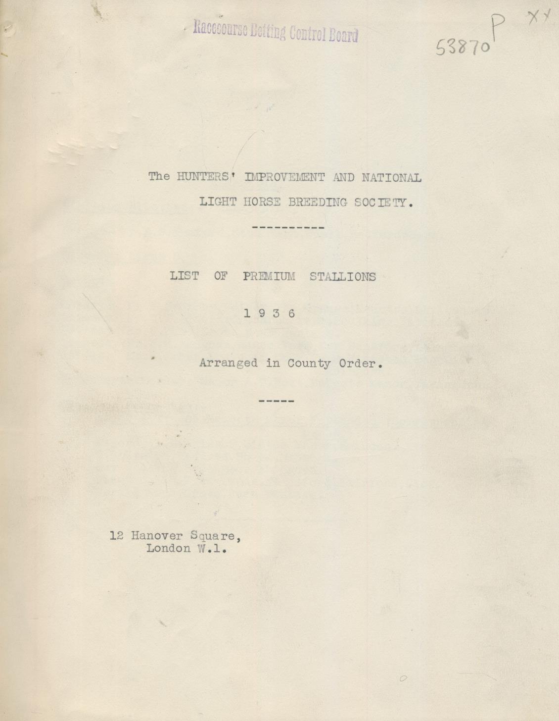 Other Sports » Horse Racing » Books » Racing Reference » THE HUNTER'S IMPROVEMENT AND NATIONAL LIGHT HORSE BREEDING SOCIETY - PREMIUM STALLIONS 1936