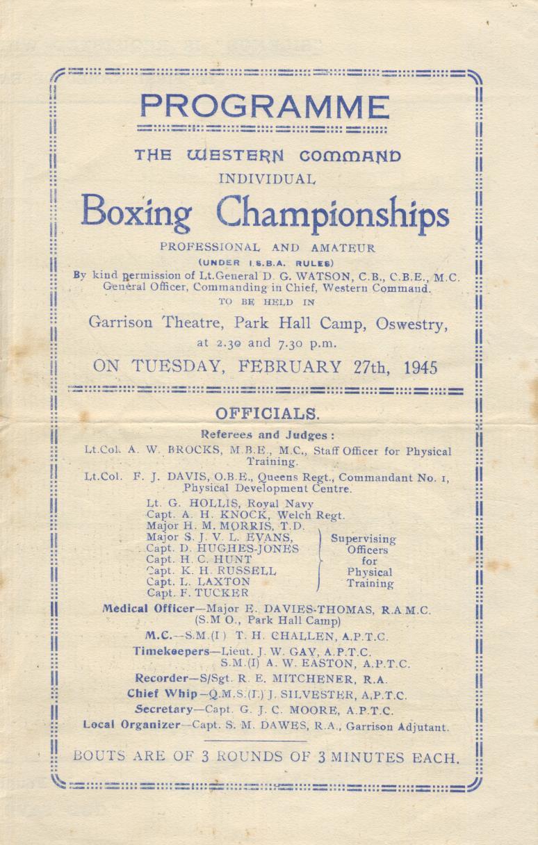 Official programme for the professional and amateur boxing championships, held at the Garrison Theatre, Park Hall Camp, Oswestry, on February 27th 1945. This included all semi-final bouts (all contenders listed), with the finals taking place in Chester the next day.