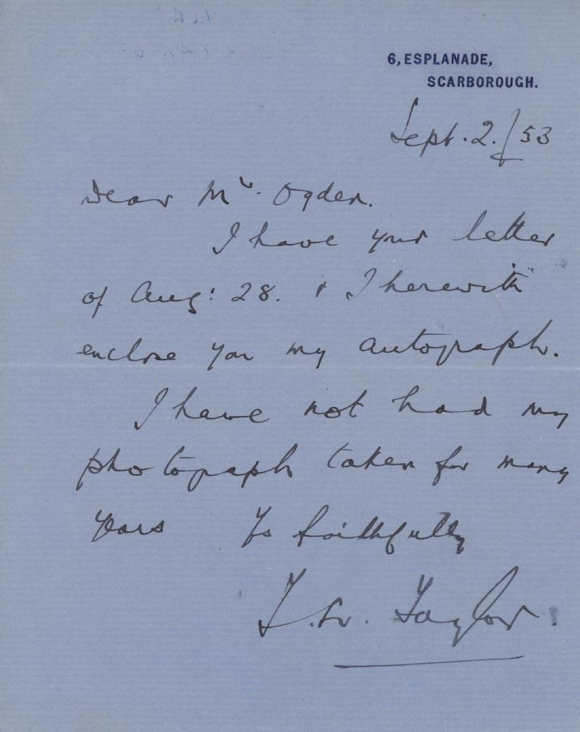 Single sheet letter to Mr Ogden in response to his request for an autograph. Dated 2 September 1953. Tom Taylor played for Yorkshire from 1899 to 1906 and was later President of the club.