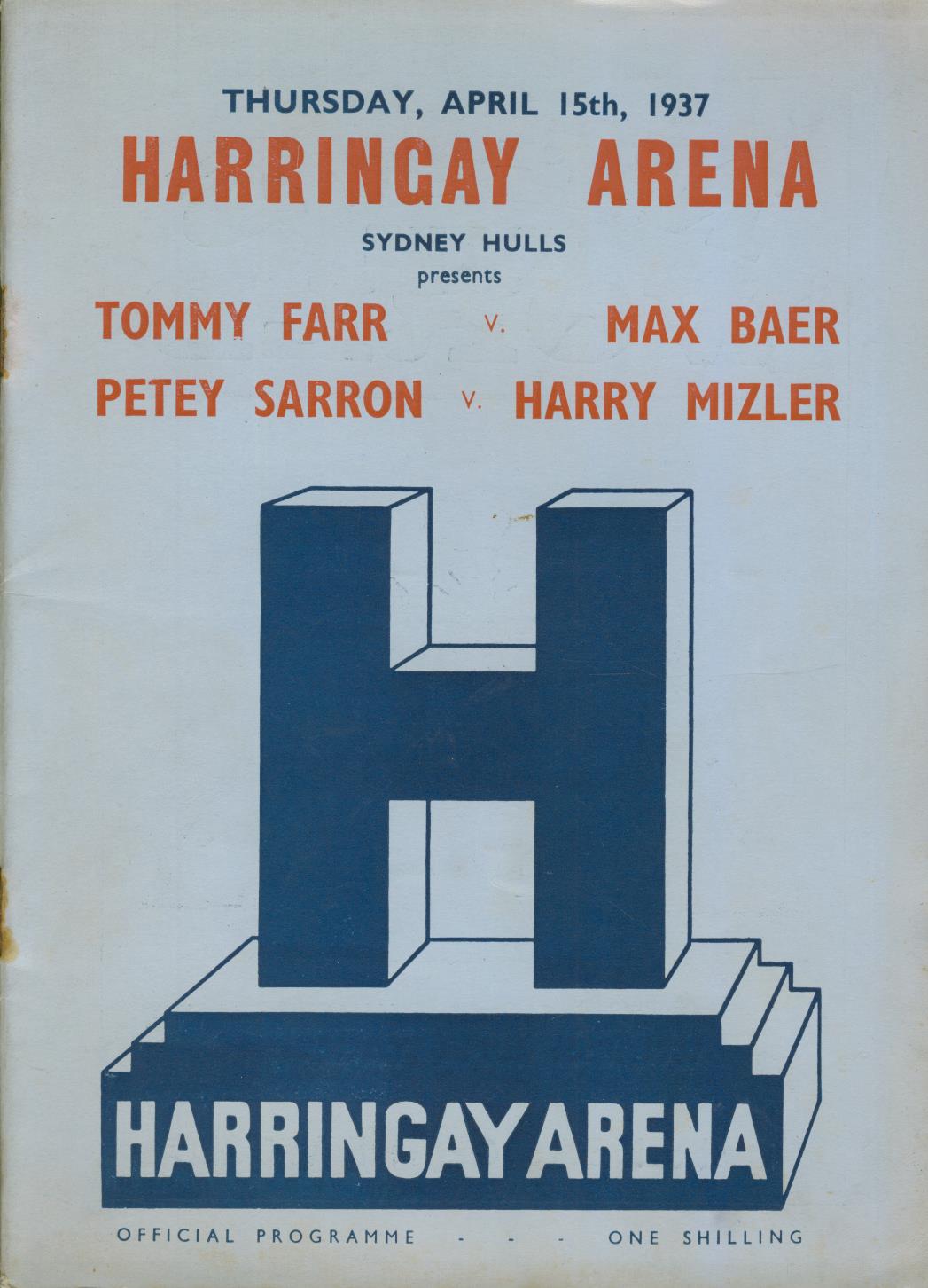 Official souvenir programme for the Heavyweight contest held at Harringay Arena on April 15th 1937. Also on the card was Petey Sarron v Harry Mizler. Farr won the fight and a few months later lost a close (and controversial) decision against Joe Louis.