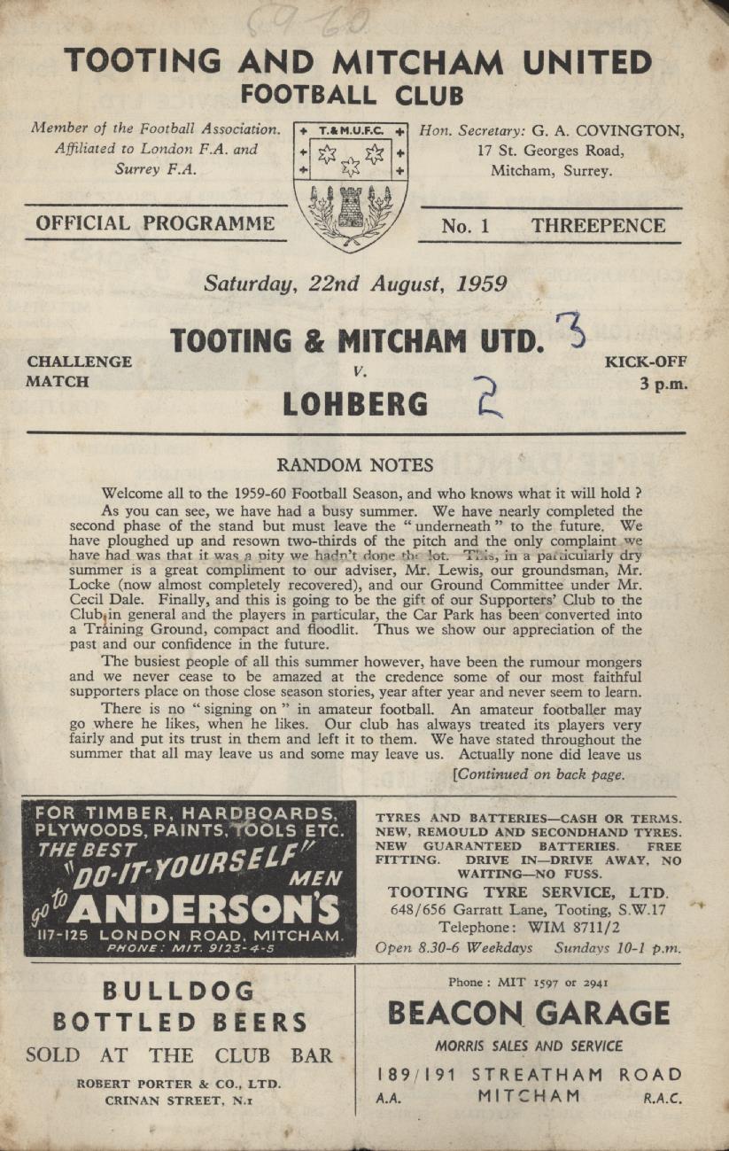 TOOTING & MITCHAM V LOHBERG (FRIENDLY) 1959-60 FOOTBALL PROGRAMME