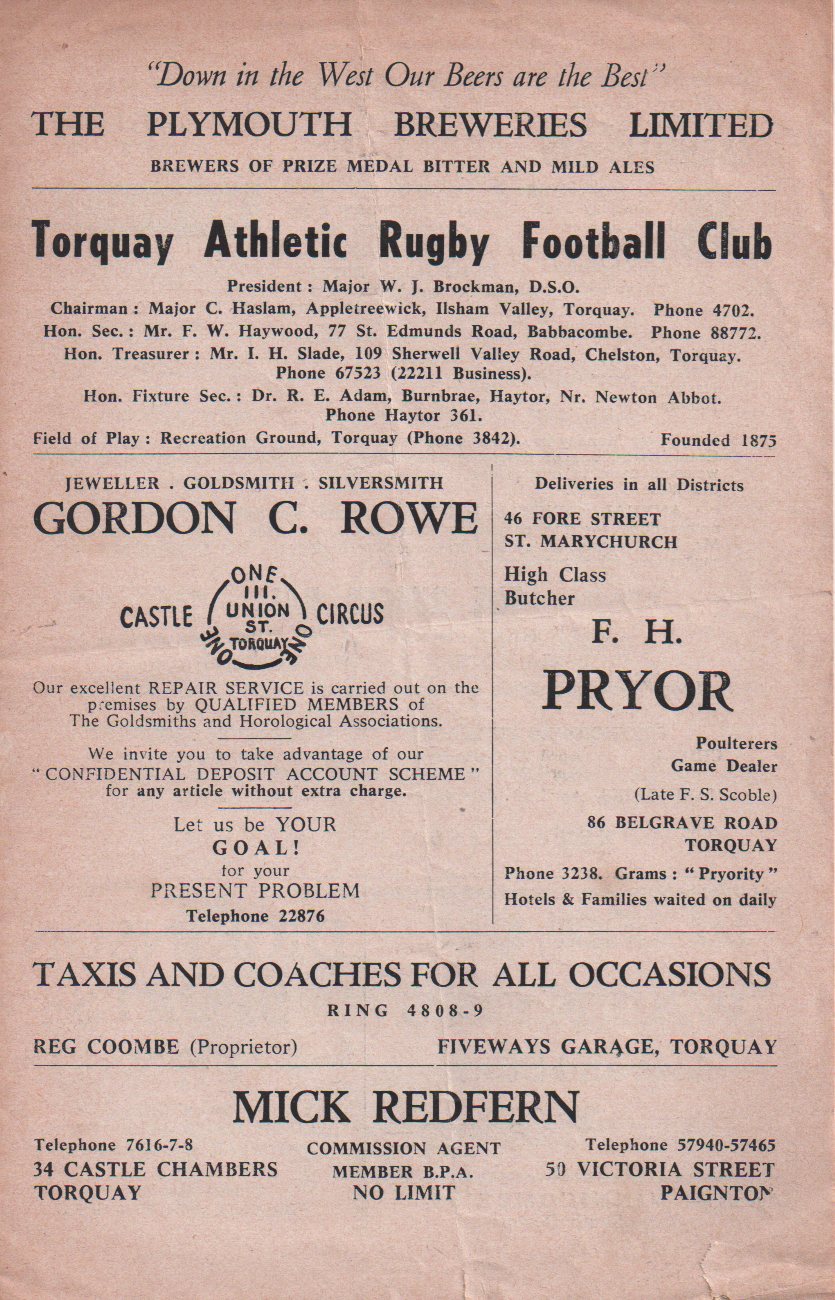 Rugby Union » Rugby Union Programmes » Club and County Programmes » TORQUAY ATHLETIC RFC V OLD CRANLEIGHANS RFC 1960